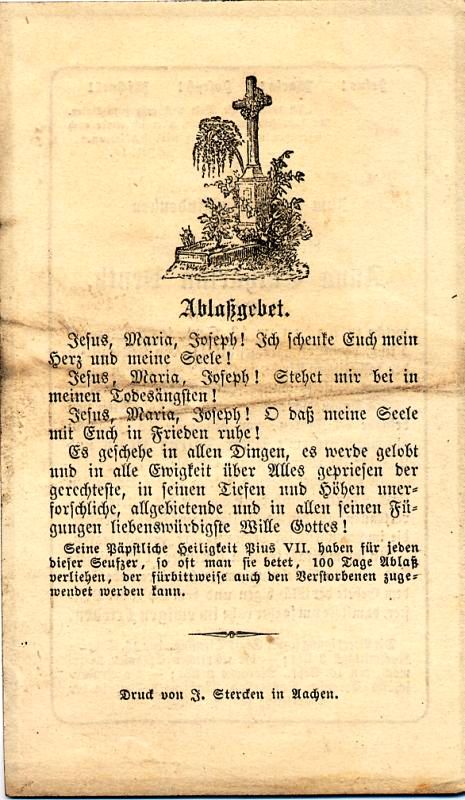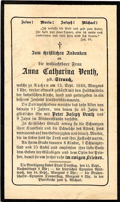 | Fast 81 J.; 48 J. Ehe mit Peter Joseph Venth, seit 9 J. Witwer; schmerzhafte Krankheit; 6 überlebende Kinder |