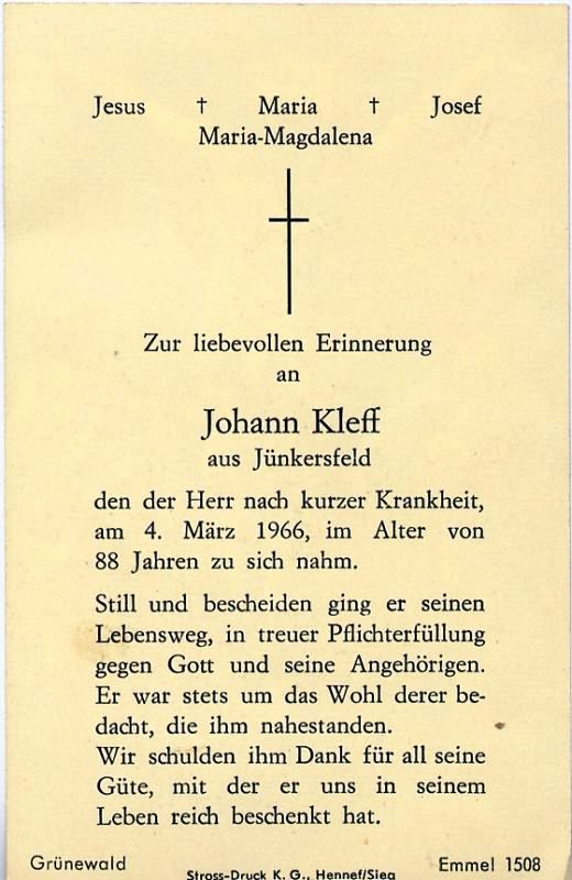 88 J.; aus Jünkersfeld; Druck in Hennef/Sieg