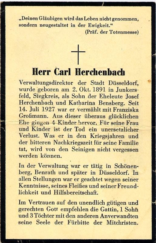 Verwaltungsdirektor der Stadt Düsseldorf; vorher tätig i der Verwaltung in Schönenberg u. Benrath; Eltern: Josef Herchenbach u. Katharina geb. Bensberg; ∞ 14.7.1927 Franziska Großmann; 4 K. |