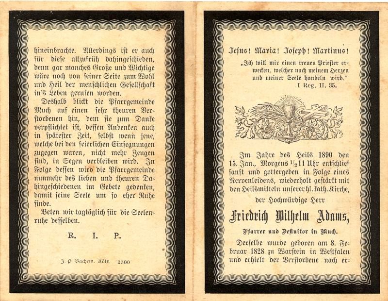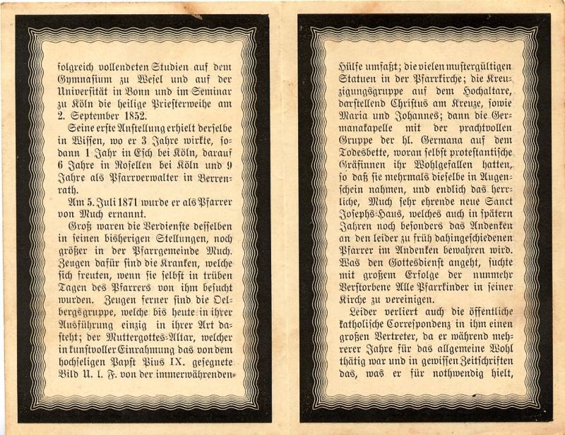 Priesterweihe Köln 2.9.1852; 3 J. in Wissen, 1 J. in Köln-Esch, 6 J. in Rosellen b. Köln u 9. J. Pfarrverwealter in Berrenrath; 5.7.1871 Pfarrer von Much; viele getan für künstlerische Ausgestaltung von Kirche und Friedhof; gründete St. Josephs-Haus; veröffentlichte in versch. kath. Zeitschriften; starb an Folgen eines Nervenleidens |
