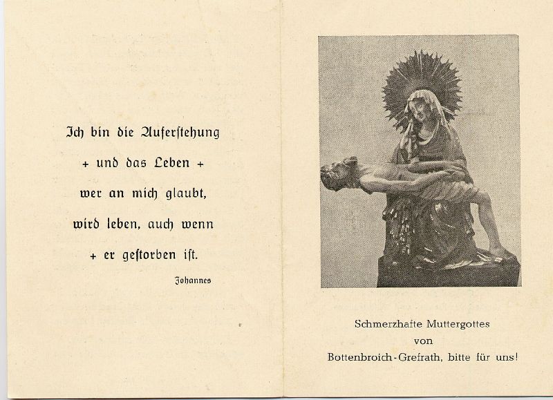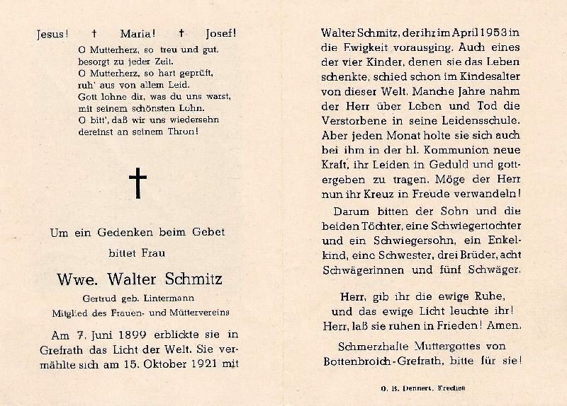 Mitgl. Frauen- u. Mütterverein; ∞ 15.10.1921 Walter Schmitz, † April 1953; 4 K., davon 1 als Kind †; jahrelanges Leiden; |