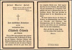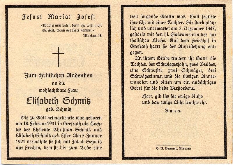 Eltern: Christian Schmitz u. Elisabeth geb. Esser; ∞ 7.1.1921 Jakob Schmitz aus Frechen; 1 Tochter; Friedhof Grefrath |