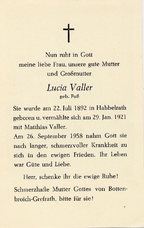 ∞ 29.1.1921 Matthias Valler; lange, schmerzvolle Krankheit |