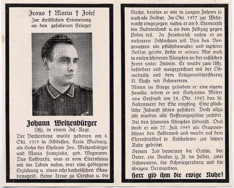 Gefallener 2. Weltkrieg; Eltern: Josef Weitzenbürger u. Maria Franziska Wegmann; Einberufung zur Wehrmacht Okt. 1937; nahm am Einmarsch ins Sudentenland u. Feldzügen gegen Polen u. Frankreich teil, schließlich an russische Front; ∞ 24.10.1942 Katharina Welter aus Grefrath; Ehrenfriedhof in Koschelewo |