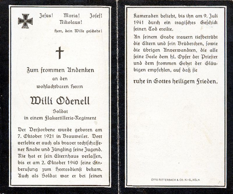 Gefallener 2. Weltkrieg; beim Baden ertrunken; 2.10.1940 Einberufung zur Wehrmacht; Eltern: Wilhelm Odenell u. Josefine geb. Müller |