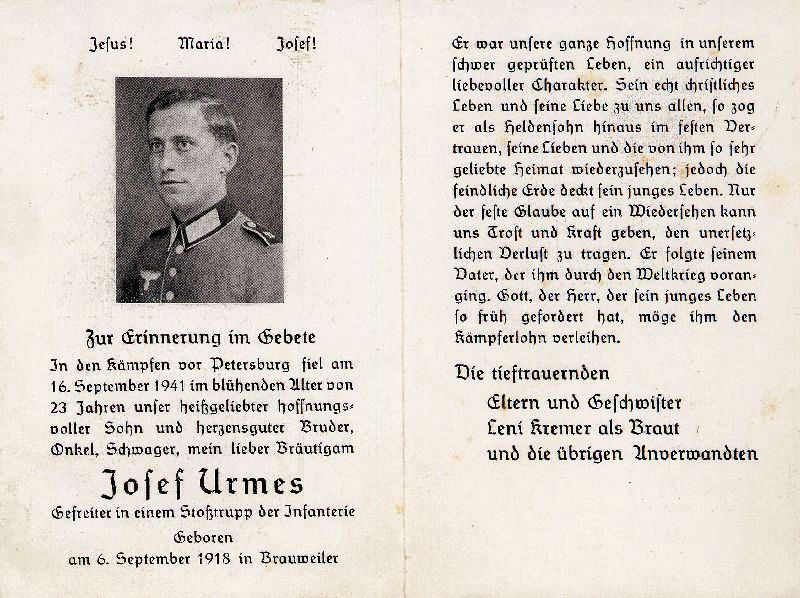 Gefallener 2. Weltkrieg; verlobt mit Leni Kremer; Er folgte seinem Vater, der ihm durch den Weltkrieg voranging |