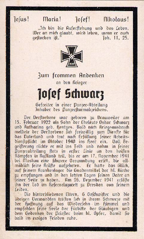 Gefallener 2. Weltkrieg; Eltern: Oskar Schwarz u. Katharina geb. Hentges; Kriegsfreiwilliger im Oktober 1940; vor Moskau am 17.11.1941 schwer verwundet |