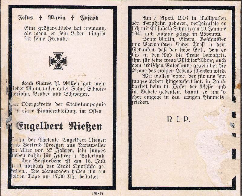 Gefallener 2. Weltkrieg; Eltern: Engelbert Nießen u. Gertrud geb. Dreeßen aus Dansweiler; ∞ 19.1.1940 Elisabeth Schmitz; wohnte zuletzt in Lövenich |