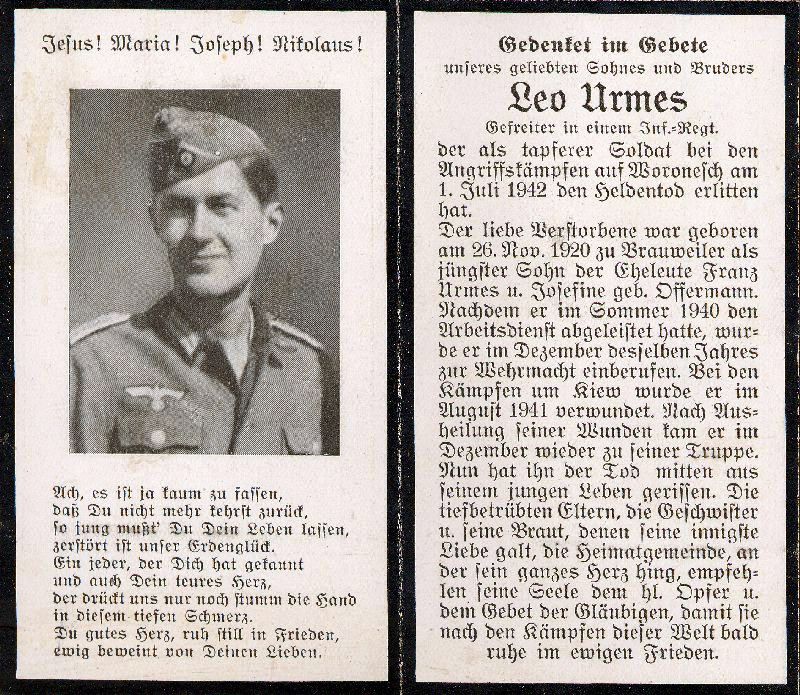 Gefallener 2. Weltkrieg; Eltern: Franz Urmes u. Josefine geb. Offermann; im Dezember 1940 Einberufung zur Wehrmacht; b. Kiew im August 1941 verwundet; nach Ausheilung wieder zu seiner Truppe; |