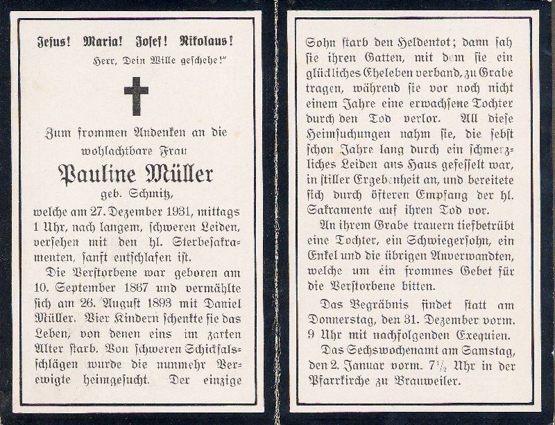 Wohnort Brauweiler; ∞ 26.8.1893 Daniel Müller, † ; 4 K., davon 1 früh †; der einzige Sohn ist 1. Weltkrieg gefallen; |