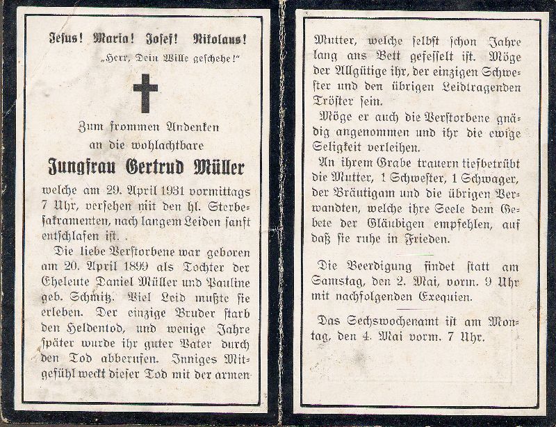 Jungfrau; Eltern: Daniel Müller u. Pauline geb. Schmitz; bruder im 1. Weltkrieg gefallen; Mutter schon seit Jahren ans Bett gefesselt; verlobt; Wohnort Brauweiler |