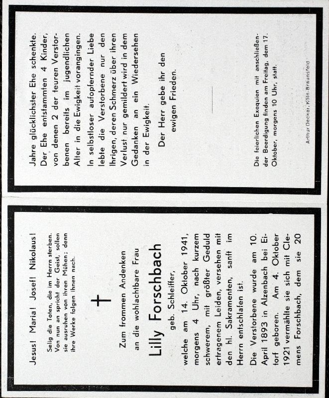 ∞ 4.10.1921 Clemens Forschbach; 4 K., davon 2 jugendl. †; Exequien in Brauweiler |