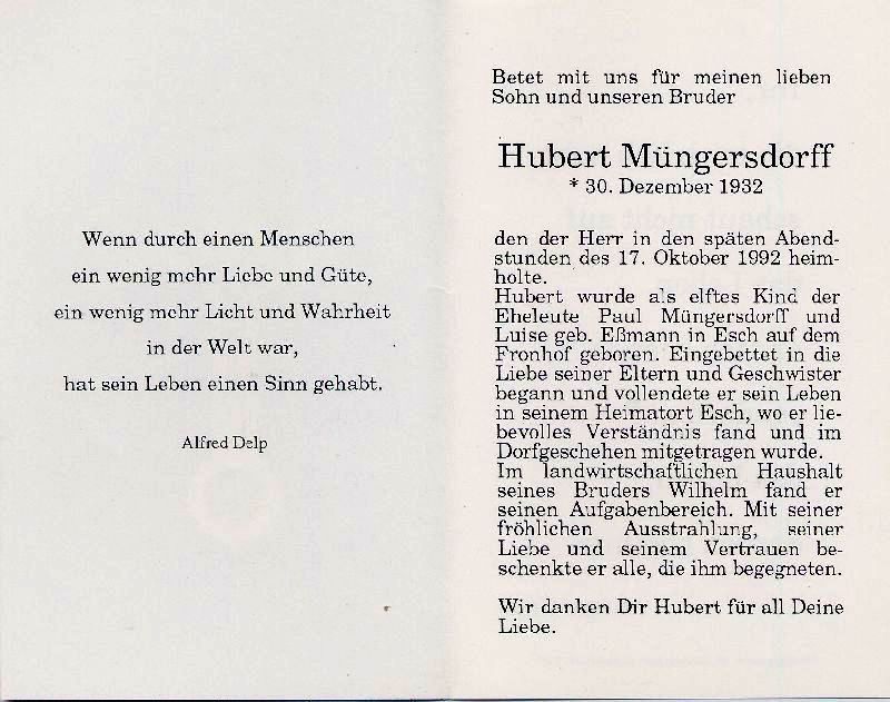 Eltern: Paul Müngersdorff u. Luise geb. Eßmann; fand liebevolles Verständnis im landwirtschaftl. Haushalt seines Bruders |