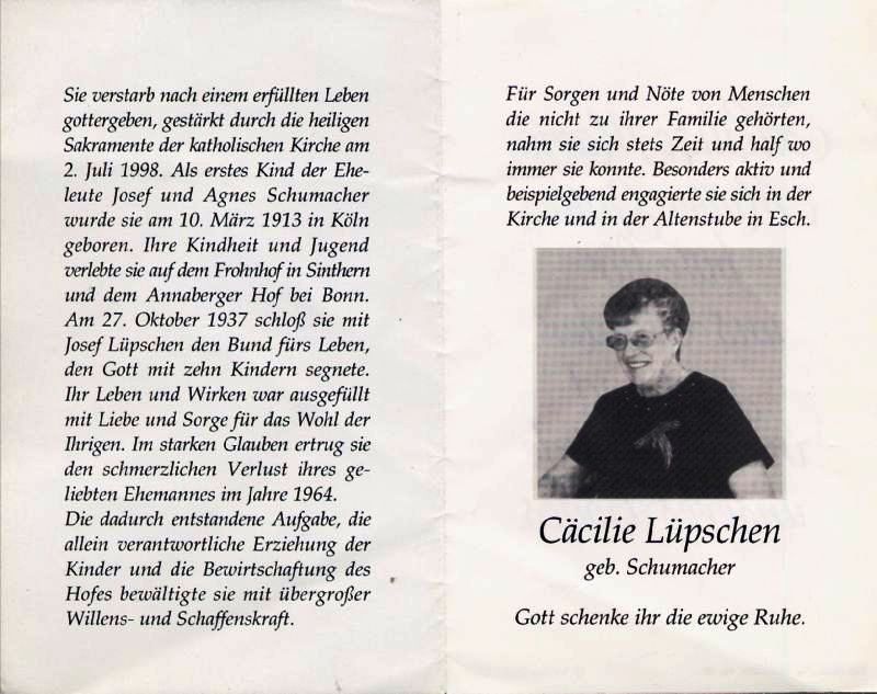 Eltern: Josef u. Agnes Schumacher; Jugend auf dem Frobhof in Sinthern und dem Annaberger Hof b. Bonn; ∞ 27.10.1937 Josef Lüpschen, † 1964; bewirtschaftete nach Tod des Mannes allein den Hof |