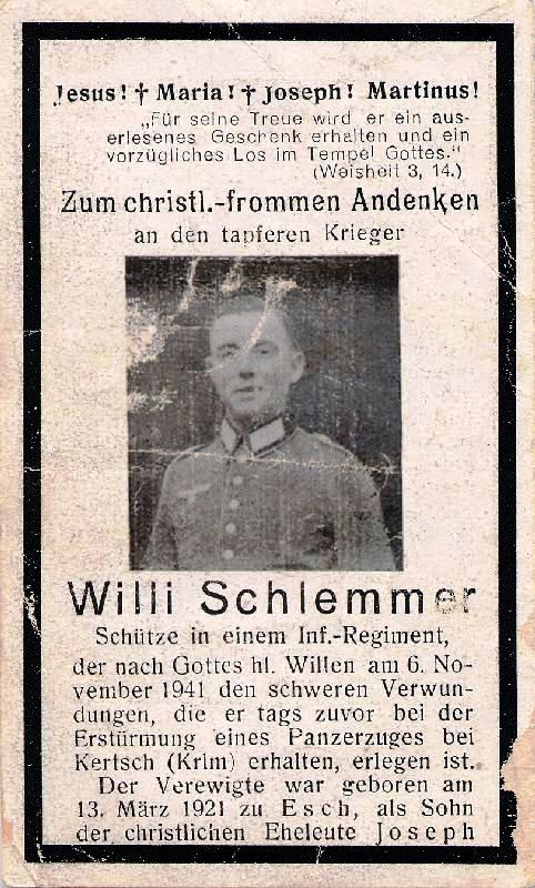 Totenzettel unvollständig; Gefallener 2. Weltkrieg; Eltern: Eheleute Joseph Schlemmer UND Katharina geb. Beyer |