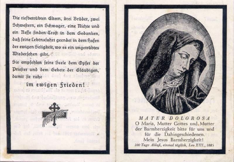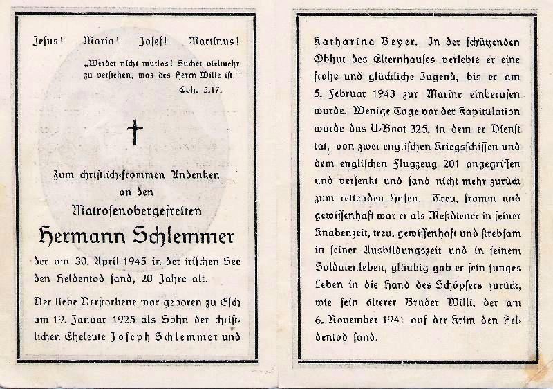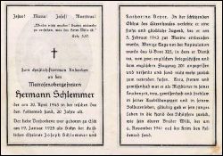 Gefallener 2. Weltkrieg; Eltern: Joseph Schlemmer u. Katharina geb. Beyer; 5.2.1842 Einberufung zur Marine; ging mit U-B∞t 325 unter; Bruder Wille am 6.11.1941 auf der Krim gefallen |