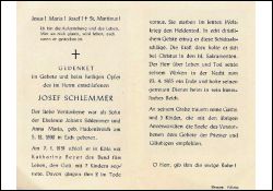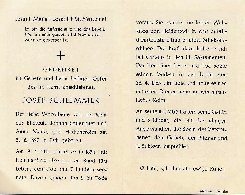 Eltern: Johann Schlemmer u. Anna Maria geb. Hackenbroich; † 7.1.1919 in Köln Katharina Beyer; 7 K., davon 2 im 2. Weltkrieg gefallen; Druck in Pulheim |