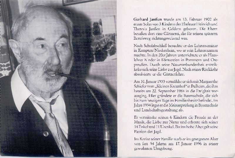 Eltern: Heinrich u. Theresia Janßen (Gärtnerei); Lehrerseminar in Kempten/Niederrhein; in 1920er Jahren Hauslehrer in Förstereien in Pommern und Ostpreußen; nach Rückkehr Gärtnerlehre; ∞ 31.1.1933 Margarethe Schiefer vom Kleinen Kreuzhof in Pulheim, † 22.9.1984; gründete Baumschule; 1934 Meisterprüfung; 6 K. |