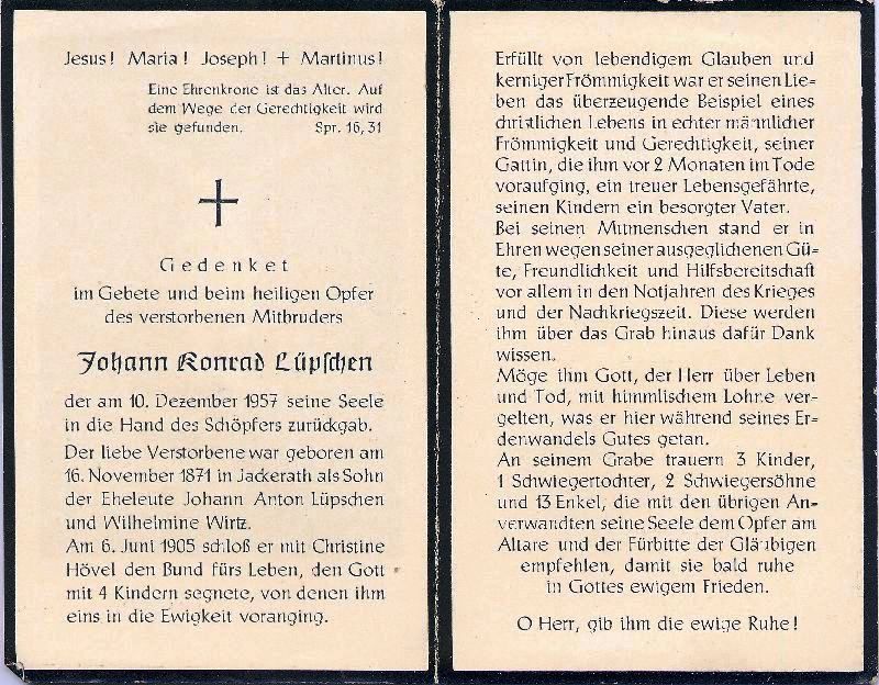 Eltern: Johann Anton Lüpschen u. Wilhelmine geb. Wirtz, † 1905; ∞ 6.6.1905 Christine Hövel; 4 K., davon 1 †; |