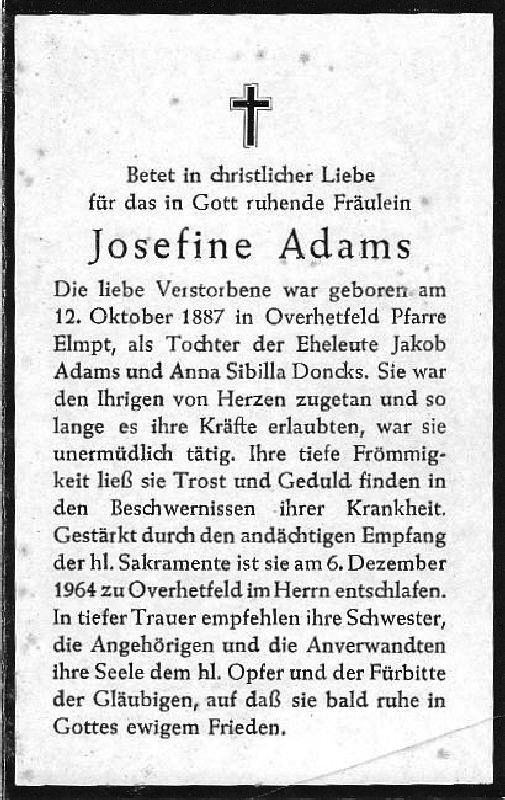 Fräulein; Eltern: Jakob Adams u. Anna Sibilla Doncks; Beschwernisse durch Krankheit; |