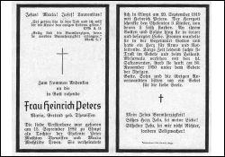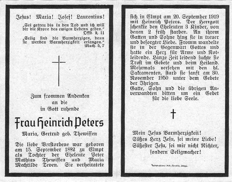 Eltern: Peter Mathias Thewissen u. Maria Mechtilde geb. Teven; ∞ in Elmpt 20.9.1919 Heinrich Peters; 3 K., davon 2 früh †; |