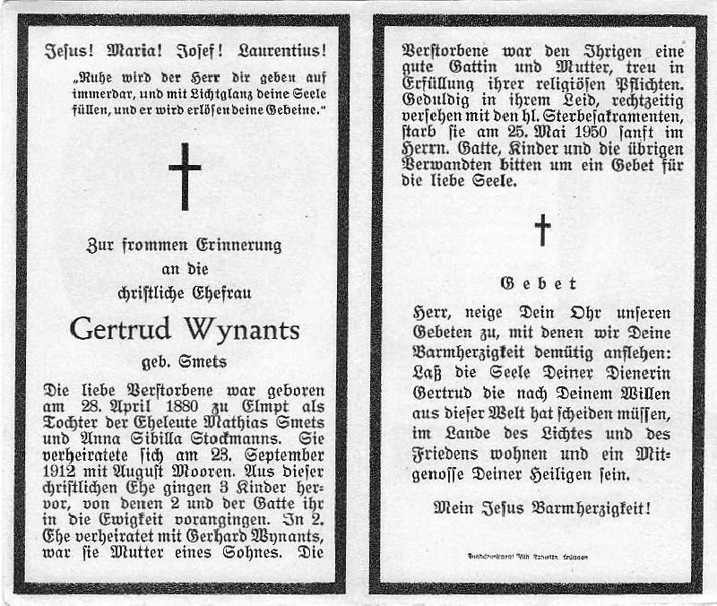 Eltern: Mathias Smets u. Anna Sibilla geb. Stockmanns; ∞ 23.9.1912 August M∞ren, † ; 3 K., davon 2 †; ∞ Gerhard Wynants; 1 Sohn |