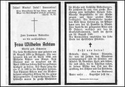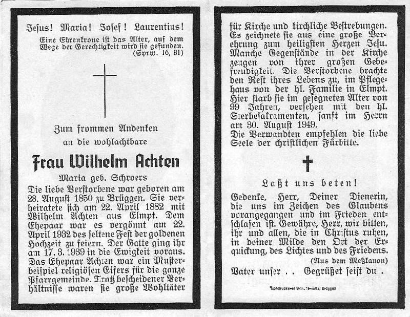 ∞ 22.4.1882 Wilhelm Achten aus Elmpt, † 17.3.1939; 1932 Goldhochzeit; trotz bescheidener Verhältnisse große Wohltäter für die Kirche; zuletzt im Pflegehaus von der hl. Familie in Elmpt;99 J. |