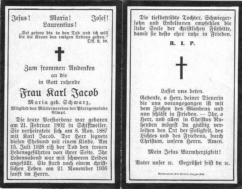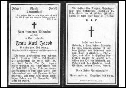 ∞ 8.11.1887 Karl Jacob, † 13.7.1928; 1 K.; im Alter schweres Leiden |