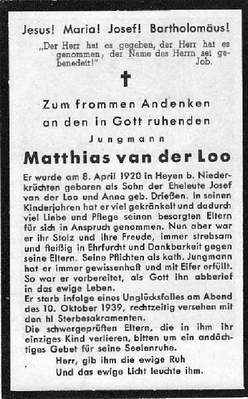 Tod durch Unglücksfall; Eltern: Josef van der L∞ u. Anna geb. Drießen; einziges Kind; in Kinderjahren kränkelnd; |