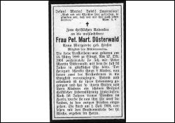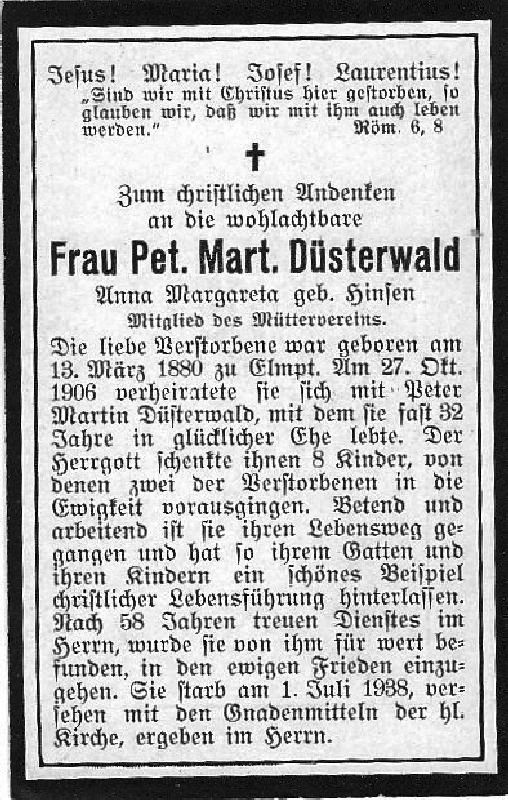 Mitgl. Mütterverein; ∞ 27.10.1906 Peter Martin Düsterwald; 8 K., davon 2 †; |
