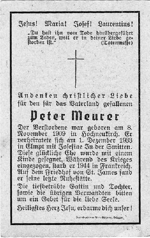 Gefallener 2. Weltkrieg; ∞ 1.12.1933 in Elmpt Josefine In der Smitten; 1 Tochter; Ruhestätte: Friedhof von St. James |