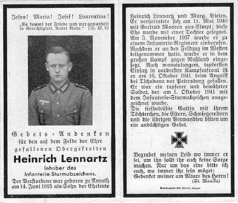 Gefallener 2. Weltkrieg; Eltern: Heinrich Lennartz u. Marg. geb. Vieten; ∞ 11.5.1940 Gertrud M∞ren aus Elmpt; 1 Tochter; 3.11.1937 einberufen; |