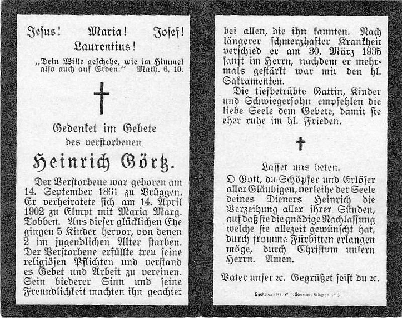 ∞ 14.4.1902 in Elmpt Maria Marg. Tobben; 5 K., davon 2 jugendl. †; längere, schmerzhafte Krankheit |