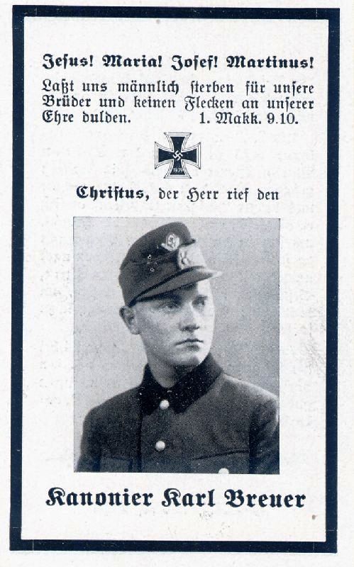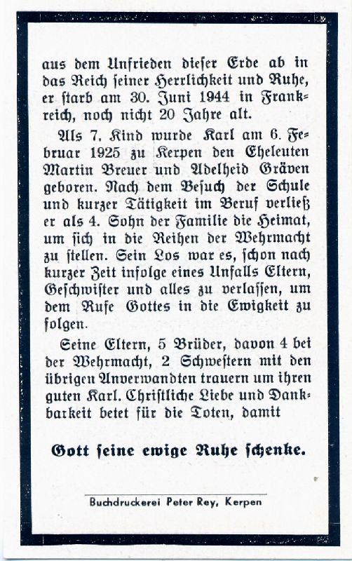 Gefallener 2. Weltkrieg; er starb infolge eines Unfalls Eltern: Martin Breuer u. Adelheid geb. Gräven; |