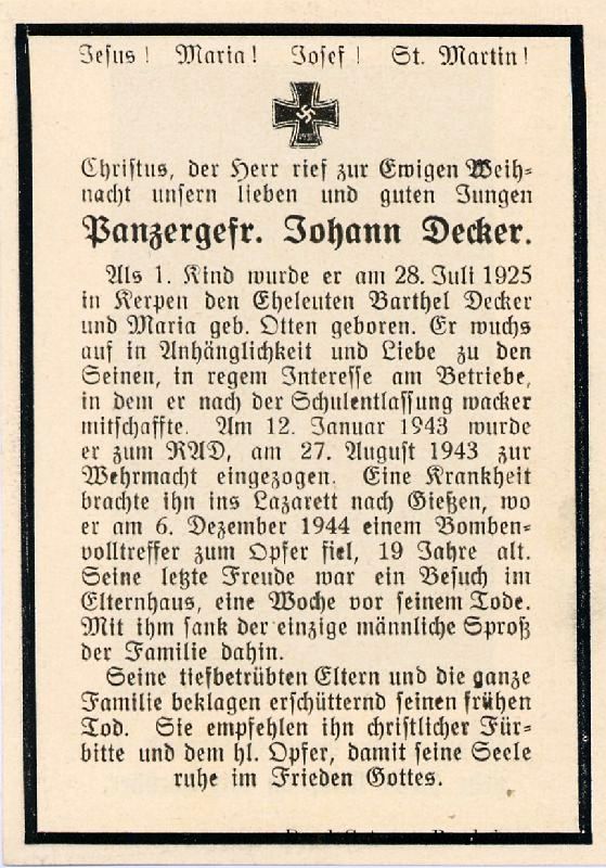 Gefallener 2. Weltkrieg; Tod durch Bombenangriff; Eltern: Barthel Decker u. Naria geb. Otten; 12.1.1943 zum Reichsabeitsdienst; 27.8.1943 Einberufung zur Wehrmacht |