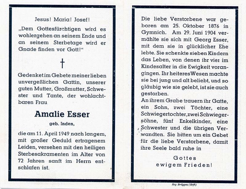 Langes Leiden; ∞ 29.6.1904 Georg Esser; 7 K., davon 4 als Kind †; Druck in Brüggen/Erft |