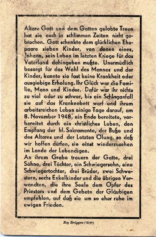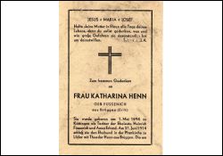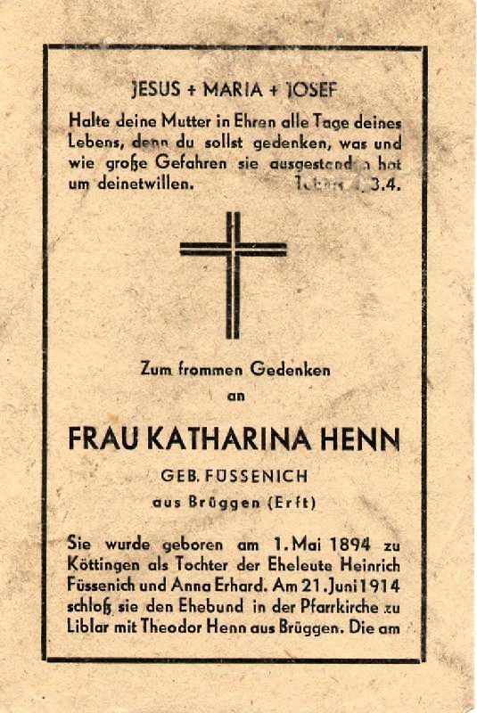 Schlaganfall; Eltern: Heinrich Füssenich u. Anna geb. Erhard; ∞ 21.6.1914 in Liblar Theodor Henn aus Brüggen; 7 K.; Sohn Johann ist im 2. Weltkrieg gefallen; |