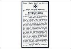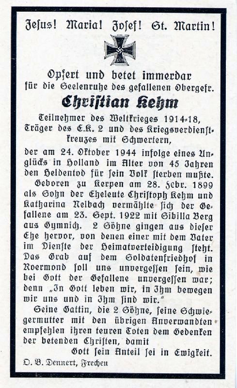 Gefallener 2. Weltkrieg; Tod durch Unfall; Teilnehmer am 1. Weltkrieg; Eltern: Christoph Kehm u. Katharina geb. Nelbach; ∞ 23.9.1922 Sibilla Berg aus Gymnich; 2 Söhne; beerdigt auf Soldatenfriedhof in Roermond |