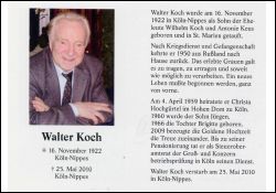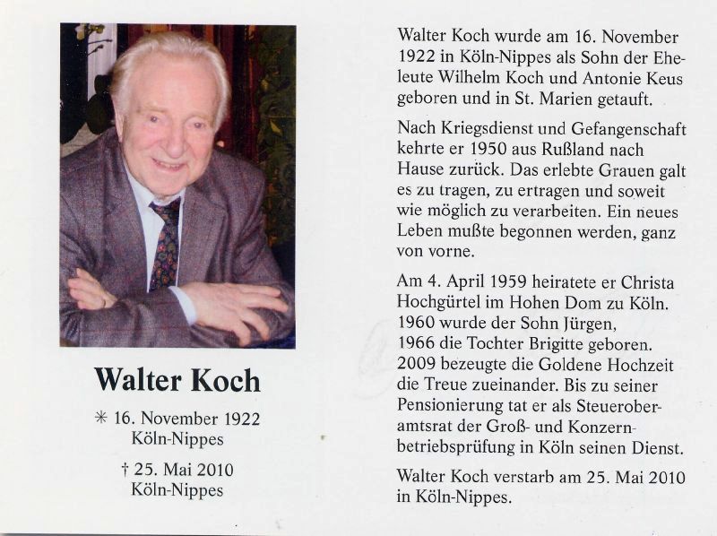 Eltern: Wilhelm Koch u. Antonie geb. Keus; nach Kriegsdienst im 2. Weltkrieg 1950 Rückkehr aus russischer Gefangenschaft; ∞ 4.4.1959 in Köln Christa Hochgürtel; Sohn Jürgen *1960, Tochter Brigitte *1966; 2009 Goldhochzeit; Steueroberamtsrat in Köln |