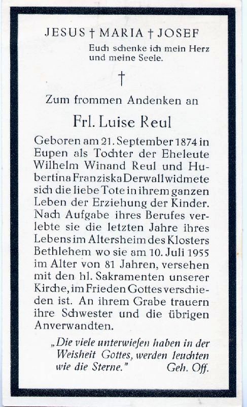 Fräulein; Eltern: Wilhelm Winand Reul u. Hubertina Franziska geb. Derwall; Lehrerin |