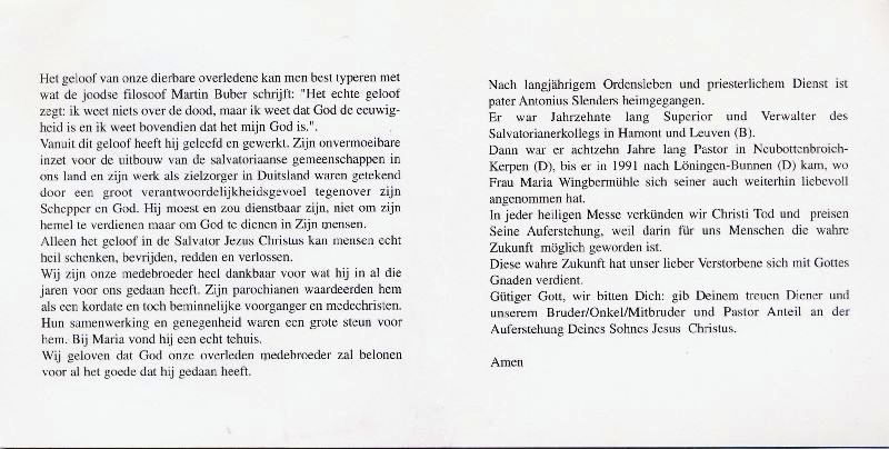 Priesterweihe 1937; jahrzehntelang Superior u. Verwalter des Salvatorianerkollegs in Hamont u. Leuveb, Belgien; 1973-1991 Rektoratspfarrverweser in Neubottenbroich (Kerpen); 1991 nach Löningen- Bunnen, wo Maria Wingbermühle sich seiner liebevoll annahm |