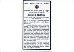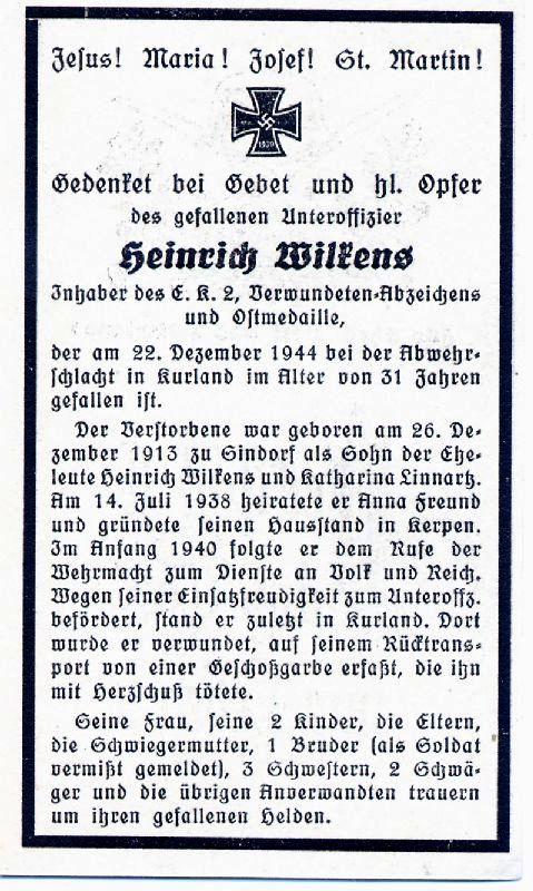Gefallener 2. Weltkrieg; Eltern: Heinrich Wilkens u. Katharina geb. Linnartz; ∞ 24.7.1938 Anna Freund; lebten in Kerpen; Anfang 1940 Einberufung zur Wehrmacht; 2 überlebende Kinder |