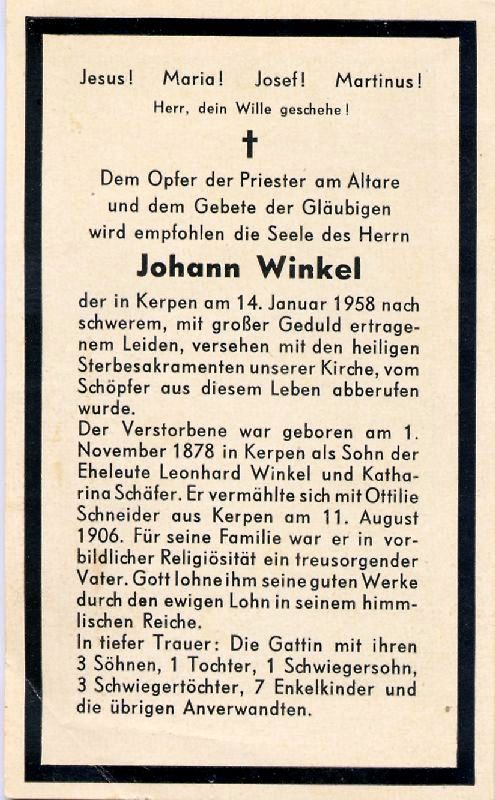Schweres Leiden; Eltern: Leonhard Winkel u. Katharina geb. Schäfer; ∞ 11.8.1906 Ottilie Schneider aus Kerpen; 4 K. |