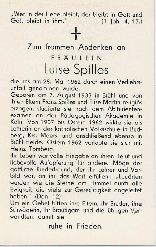 Fräulein; Tod durch Verkehrsunfall; Eltern: Franz Spilles u. Elise geb. Martin; Studium Pädagog. Akademie Köln; 1957-Osten 1962 Lehrerin kath. Volksschule in Budberg, Kr. Moers, anschließend in Brühl-Heide. Ostern 1962 Verlobung mit Heinz Tomberg |