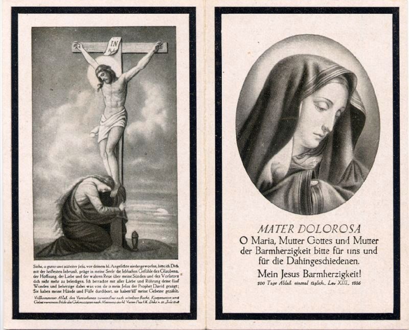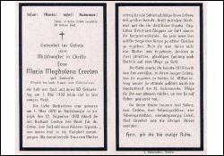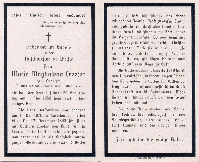 ∞ 12.12.1890 Gerhard Creeten (Flame), † 1919; 9 K., davon 3 †; Mitgl. Frauen- u. Mütterverein; langes Leiden; Druck in Frechen; Pfarrgemeinde St. Audomar |