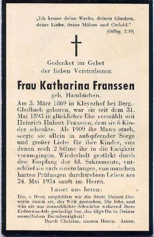 ∞ 31.5.1893 Heinrich Hubert Franssen, † 1909; 6 K., davon 2 Söhne †; |