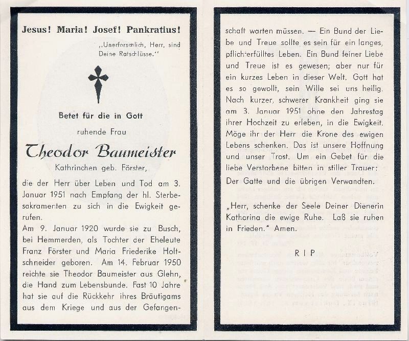 ∞ 14.2.1950 (richtig wohl: 1940) Theodor Baumeister aus Glehn; wartete 10 J. auf Rückkehr des Bräutigams aus dem Krieg und der Gefangenschaft |