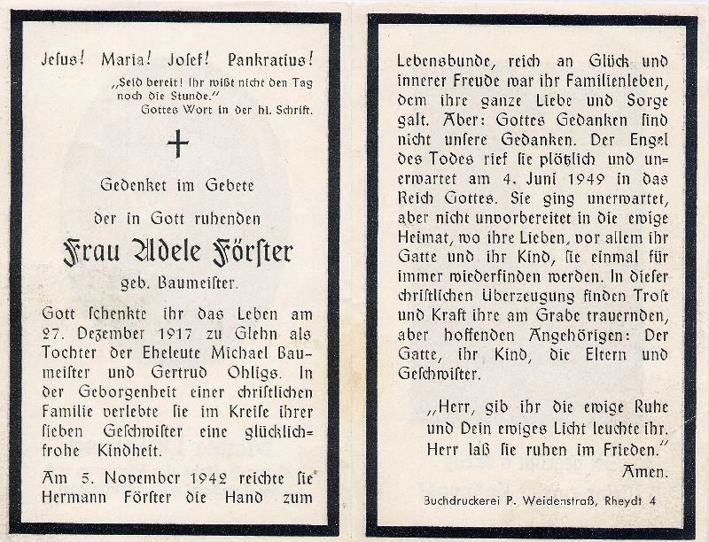 Eltern: Michael Baumeister u. Gertrud geb. Ohligs; ∞ 5.11.1942 Hermann Förster; 1 K.; Druck in Rheydt 4 |