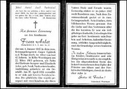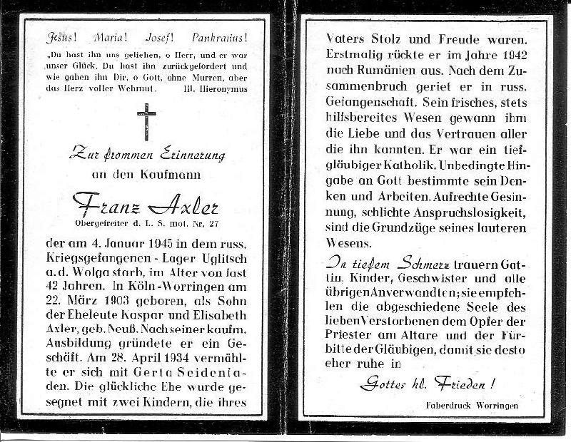 | Gefallener 2. Weltkrieg; Kaufmann; Eltern: Kaspar Axler u. Elisabeth geb. Neuß; ∞ 28.4.1934 Gerta Seidenfaden; 2 K.; 1942 rückte er nach Rumänien aus, nach dem Zusammenbruch in russ. Gefangenschaft |