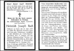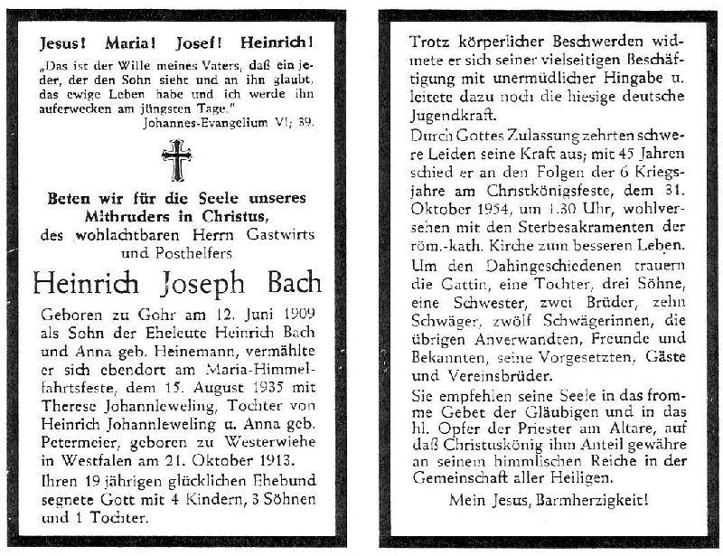 | Gastwirt u. Posthelfer; Eltern: Heinrich Bach u. Anna geb. Heinemann; ∞ 15.8.1935 Therese Johannleweling, als Tochter von Heinrich Johannleweling u. Anna geb. Petermeier geb. 21.10.1913 in Westerwiehe i.W.; 4 K. |